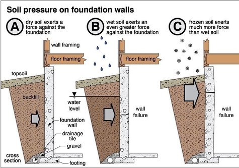 One of the major repercussions observed during our home inspections is horizontal cracking and bowing on the foundation walls seen from basements and crawlspaces. Foundation cracks may develop when there is moisture saturated soil pushing on the exterior face of the foundation wall. The hydrostatic pressure forces the wall to bend inward creating a crack and opening in the foundation wall. This crack is usually horizontal, open more than a hairline and shows signs of water intrusion. Hydrostatic pressure refers to the pressures caused by water pushing against slabs and foundations, particularly underground concrete block or poured concrete walls of foundation and crawlspaces.